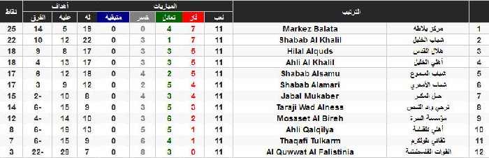 واختتم حامل اللقب هلال القدس وأهلي الخليل النصف الأول من المسابقة في المركزين الثالث والرابع برصيد 18 نقطة، لكن فارق الأهداف حدد أفضلية الترتيب.