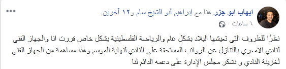 قرر الجهاز الفني للفريق الأول لكرة القدم في نادي الأمعري، ايهاب أبو جزر، التنازل عن مستحقاته المالية في ظل الظروف الصعبة وتوقف النشاط الرياضي بسبب جهود مكافحة فيروس كورونا.
