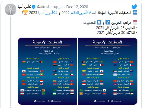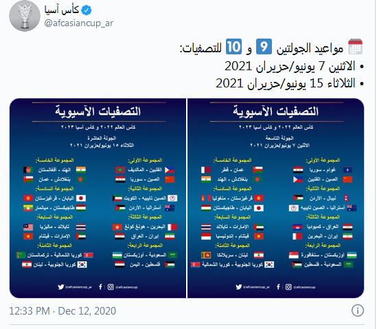 وكانت هذه المباريات تأجلت بسبب تأثيرات جائحة فايروس كورونا المستجد (كوفيد-19) قبل أن يقوم الاتحاد الآسيوي لكرة القدم بتحديد المواعيد الجديد.