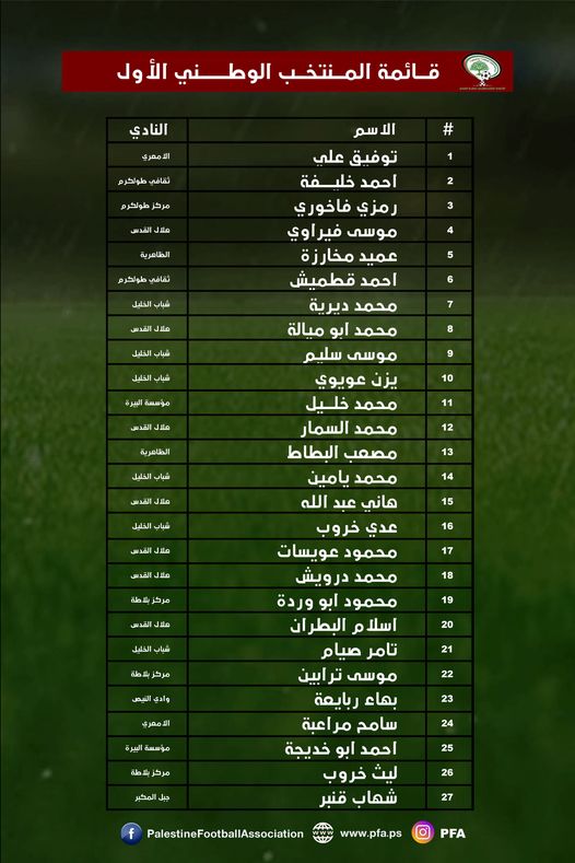 أعلنت دائرة المنتخبات بالاتحاد الفلسطيني لكرة القدم عن قائمة لاعبي المنتخب الوطني الأول المستدعية من قبل المدير الفني للفدائي نور الدين ولد علي، وذلك لخوض معسكر تدريبي داخلي في مدينة الأمل الشبابية الرياضية بأريحا خلال الفترة من 19 إلى 22 شباط/فبراير الجاري.