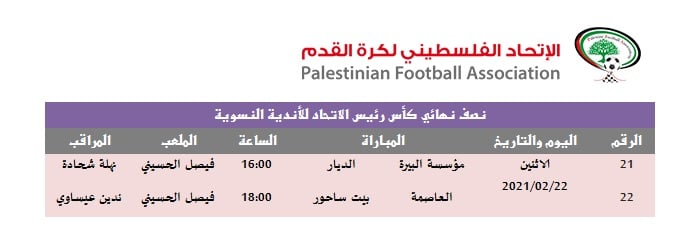 أعلن الاتحاد الفلسطيني لكرة القدم، جدول مباريات الدور نصف النهائي من بطولة كأس رئيس الاتحاد للأندية النسوية التي تقام بالتعاون مع الاتحاد الياباني لكرة القدم، وذلك على النحو الآني: