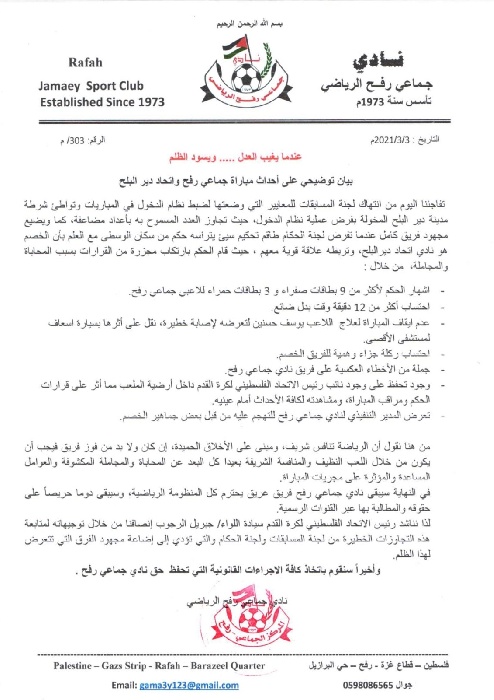 * لم يتم الإساءة لأي لاعب أو اداري من نادي جماعي رفح سواء داخل الملعب أو بعد انتهاء المباراة