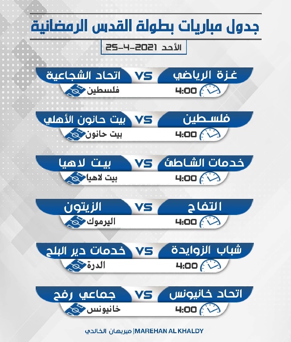 تفتتح اليوم الأحد بطولة القدس الرمضانية التنشيطية التي ينظمها المجلس الأعلى للشباب والرياضة، بست مواجهات :