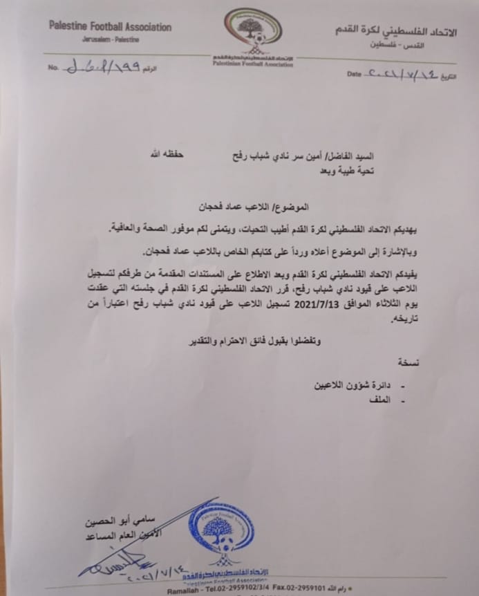 قرر اتحاد كرة القدم الموافقة على طلب نادي شباب رفح قيد الوافد الجديد عماد فحجان في صفوف الزعيم بعد الاطلاع على كافة المستندات المقدمة لإنهاء اجراءات التسجيل.