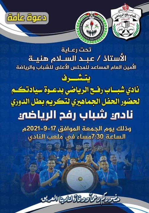 ينظم مجلس إدارة نادي شباب رفح احتفالاً جماهيرياً بمناسبة تتويجه فريقه الأول لكرة القدم بلقب الدوري الممتاز وذلك برعاية المجلس الأعلى للشباب والرياضة، مساء الجمعة.