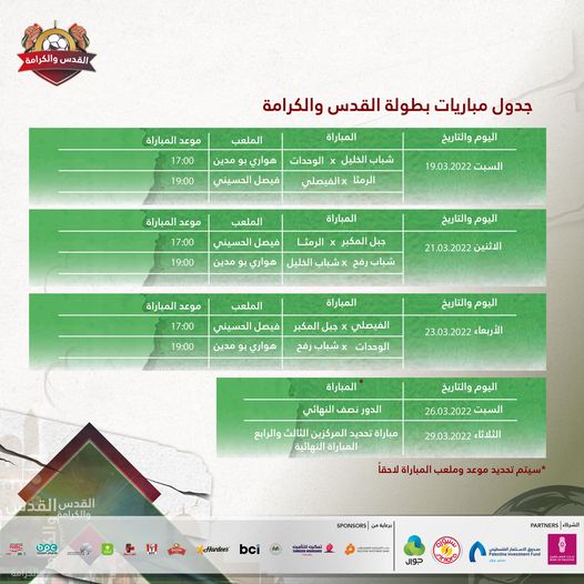 أعلن الاتحاد الفلسطيني لكرة القدم، عن جدول مباريات بطولة القدس والكرامة التي تستضيفها فلسطين خلال الفترة 19-29 اذار الجاري تحت رعاية جلالة الملك عبد الله الثاني بن الحسين والرئيس محمود عباس.