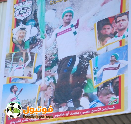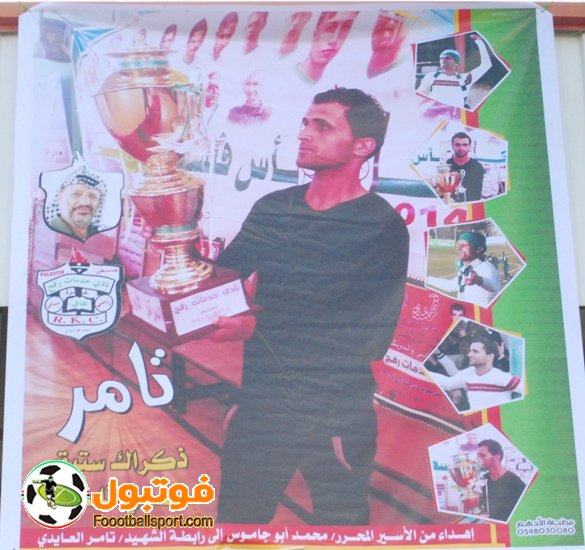 حين رفعت لافتات حملت صورة الشهيد البطل تامر العايدي احد اعضاء رابطة مشجعي الخدمات الرفحي ,, والذي طالته الة الاحتلال الاسرائيلي في الحرب الاخيرة على غزة ولطالما كان وفيا ومخلصا ومحبا لفريقه الاقرب الي قلبه خدمات رفح ، لترسم لوحة فنية عنوانها الوفاء والاخلاص للشهيد العايدي الحاضر الغائب والتي وقف لها كل من شاهدها احتراما وتقديرا لوفائهم للشهيد ..