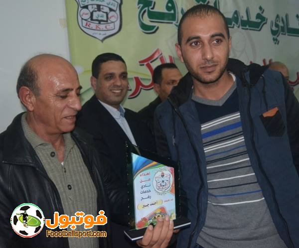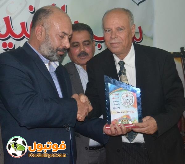 كرم خدمات رفح ثُلة من كوادره ولاعبيه في حفل حضره النائب بمجلس التشريعي المهندس اشرف جمعة ورجل الاعمال محمد ابو عرمانة ورجل الاعمال اياد غبون وعضو اتحاد الكرة فتحي ابو العلا وابناء نادي خدمات رفح ورابطة مشجعي خدمات رفح .