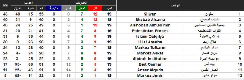 حصن " سلوان " صدارته لدوري الدرجة الأولى برصيد 43 نقطة بفارق 3 نقاط عن السموع و جمعية الشبان المسلمين ، في حين تذيل بيت امر و أنصار القدس ومركز جنين لائحة الترتيب ..