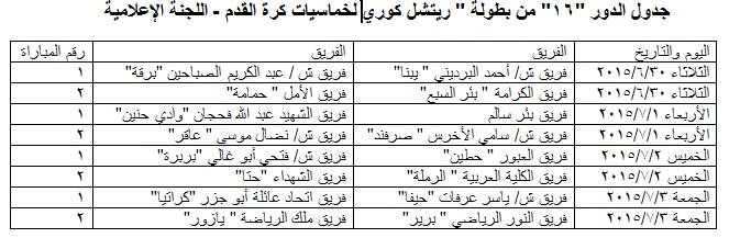 مباريات الأثنين: ( يبنا 3-1 الجورة)، ( برقة 4-0بيسان).