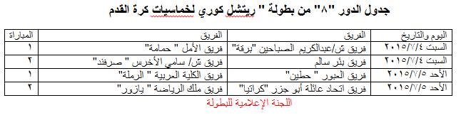 تأهلت فرق "برقة وحمامة وبئر سالم وصرفند وحطين والرملة وكراتيا ويازور" إلى الدور الثمانية من بطولة " ريتشل كوري" الثامنة لخماسيات كرة القدم التي ينفذها نادي خدمات رفح بالشراكة مع مركز البرامج النسائية – رفح، بتمويل من مؤسسة ريتشل كوري للعدالة والسلام.