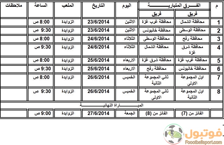 أعلن اتحاد كرة القدم عن جدول مباريات بطولة دوري منتخبات المحافظات للناشئين ؛وذلك لمحافظات قطاع غزة الخمس , حيث ستنطلق البطولة صباح الاثنين وتستمر حتى الجمعة وتنتهي قبل شهر رمضان المبارك ,على النحو الأتي: