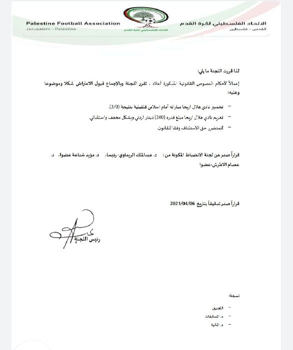 وقررت لجنة الانضباط باتحاد كرة القدم قبول الطعن المقدم من الاسلامي وتخسير هلال أريحا (3-0)، وتغريمه مالياً، بسبب إشراك لاعب موقوف، ضمن منافسات الجولة العشرين من المسابقة.