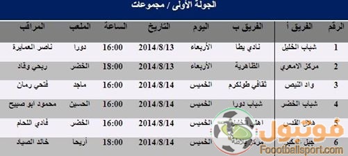 أعلنت لجنة المسابقات العامة بالإتحاد الفلسطيني لكرة القدم، مساء اليوم الأثنين، عن موعد ومكان إقامة مباريات الجولة الأولى من دوري المجموعات لبطولة كأس الشهيد أبو عمار، لأندية المحترفين، وذلك على النحو الآتي: