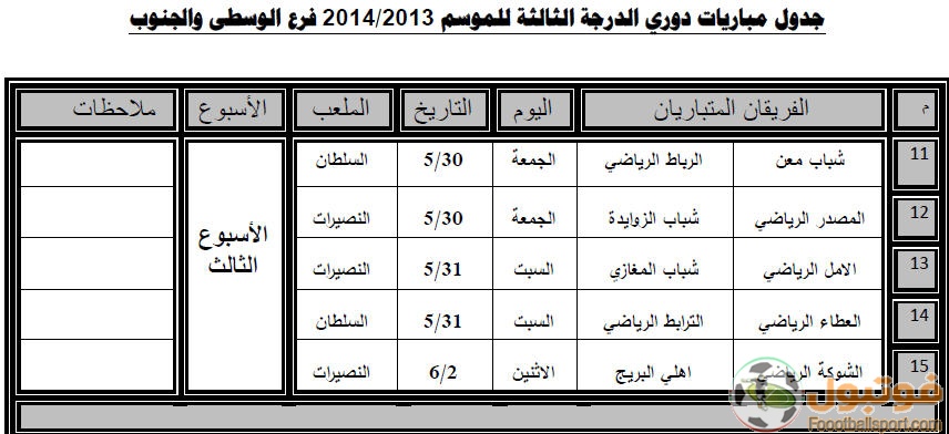 أعلنت لجنة المسابقات للاتحاد الفرعي " الوسطى والجنوب عن مواجهات الجولتين " 3 ، 4 " من دوري الدرجة الثالثة :
