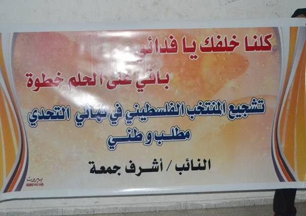 جاء ذلك خلال الاتصال الهاتفي الذي اجراه النائب أشرف جمعة عضو المجلس التشريعي الفلسطيني مع اللواء جبريل الرجوب قدم فيه التهاني بعيد ميلاده وثمن موقفه ودوره فى انجاح زيارة السيد جوزيف بلاتر رئيس الاتحاد الدولي لكرة القدم والتي ساهمت بشكل كبير فى دعم الرياضة الفلسطينية فى المحافل الدولية وإيصال صوت الرياضي الفلسطيني الي كل العالم وهو نجاح كبير للمنظومة الرياضية التي يقودها الرجوب بكل إقتدار نحو التطور والتقدم الي مستويات عالمية .