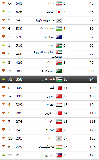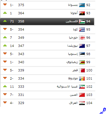 واحتل الفدائي بهذه القفزة الهائلة حسب وصف موقع الاتحاد الدولي المركز الـ94 عالمياً ، والـ10 آسيوياً وكذلك عربياً، متقدماً على العديد من المنتخبات العريقة في كرة القدم الآسيوية والعربية.