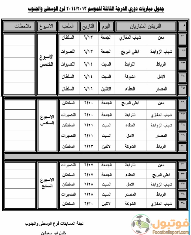 أعلنت لجنة المسابقات في اتحاد كرة القدم " فرع الوسطى والجنوب " عن مواعيد مباريات الأسابيع " 5 ، 6 ، 7 " من دوري الدرجة الثالثة لكرة القدم :